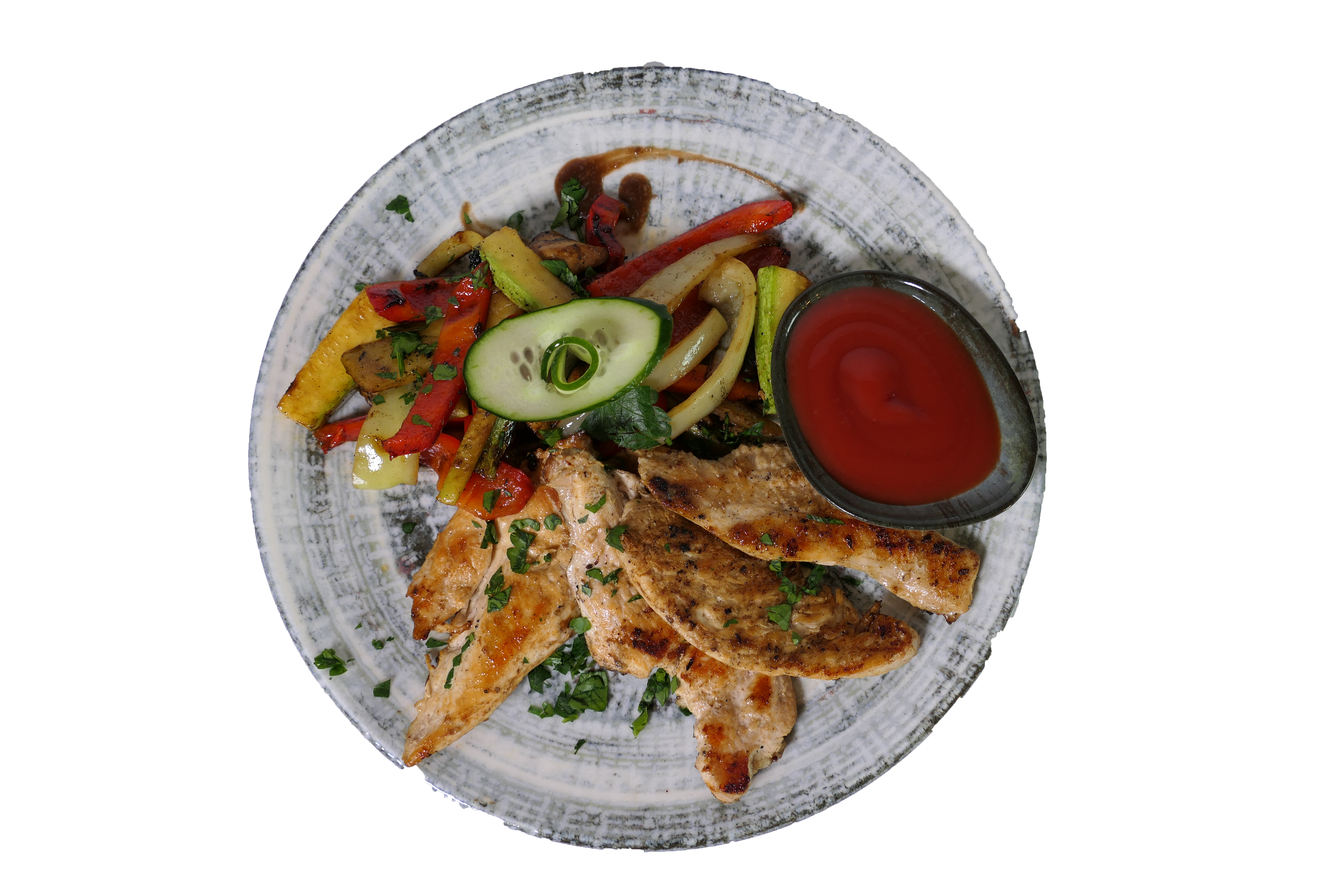 Pileći file sa kikiriki puterom i indijskim orasima uz prilog tvrdo kuhano jaje, sir, riža, ananas